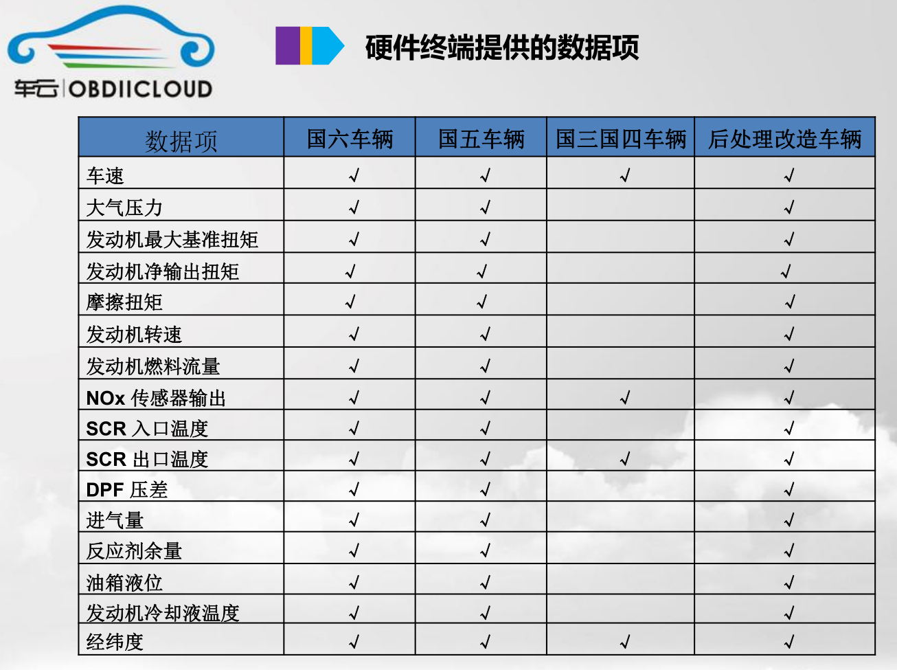 &杭州環(huán)保局關(guān)于對新注冊登記重型柴油車實施車載排放診斷系統(tǒng)(OBD)在線接入的通告》自 2019 年 1 月 1 日起,將對進口、銷售及轉(zhuǎn)入至杭州的重型柴油車(最大總質(zhì)量大于 3.5 噸(不含)的壓燃式發(fā)動機汽車,包括客車、貨車、專項作業(yè)車等上道路行駛車輛),在登記上牌環(huán)節(jié)排放檢驗前,實施車載排放診斷(以下簡稱“OBD”)在線接入